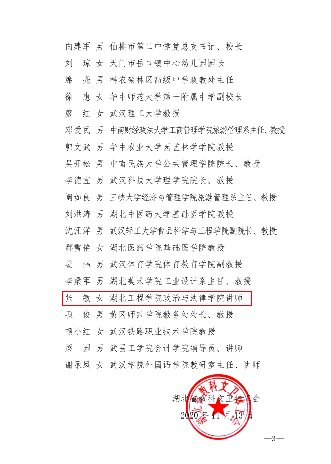 张敏,女,1979年11月生,哲学博士,中共党员,湖北工程学院政治与法律学院思政课教师。2020年11月13日,荣获湖北“师德先进个人”称号。